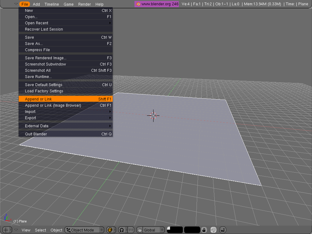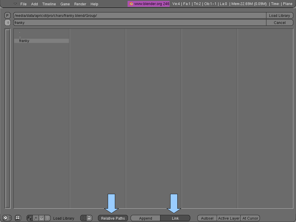 We want to link our main character to this level. Choose File -> Append or Link.