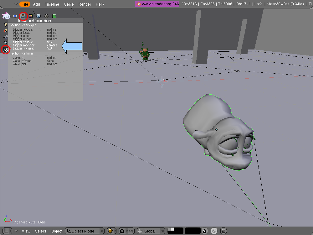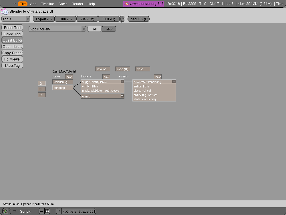 Scripting interactionUsing Crystal Space + CEL + B2CS + Blenderby Dariusz DawidowskiIntroductionThis tutorial shows solution how to make something practical using Apricot pipeline but doesn't teach details. Also note that tools are under heavy developing and some names or techniques can be outdated when you reading this. Always please refer Crystal Space , CEL , Blender2crystal and Blender manuals. Step 1 - Scene setupLet's put main character and NPC on one scene, also setup simple scene and navigation graph covering it. > Use the file in SVN: pro/tutorials/scripting_interaction_01.blend Step 2 - PursueTime for first interaction. Sheep wandering around. But this is bloodthirsty sheep so she will start to pursue us when we close to her. There is standard Property Class called Trigger (don't confuse with Quest Trigger). Trigger is capable to detect other entity in desired range using choosed shape like: box, sphere, beam and above mesh (defined outline scale around mesh). It can be positioned in 3d space or just automatically following entity's mesh. In case when other entity enter in trigger range it sends message cel.trigger.entity.enter, when this entity will leave range it sends message cel.trigger.entity.leave. Set trigger for a sheep. Enable automatic following mesh position, enable monitoring for entity named 'camera' only - it's standard name of player character in B2CS. And set sphere radius to 5. Lets make reaction for a trigger. Extend NpcTutorial Quest (for tutorial purposes I made NpcTutorial4.xml to not overwrite the old one). So during wandering state if message cel.trigger.entity.enter will income from Trigger Property Class - make debugprint on console 'I can see you !!'. After all operations you need to switch to some state to make a loop (ofcourse it makes no sense in oninit and onexit ofcourse) in this case we looping in wandering state. > Use the file in SVN: pro/tutorials/scripting_interaction_02.blend To the Python Property Class used by NPC add Action for pursuing: